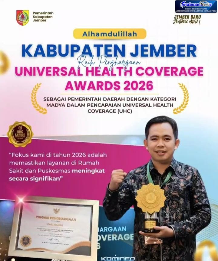 TNews, JEMBER – Pemerintah Kabupaten Jember kembali mencatatkan prestasi di tingkat Nasional dengan menerima penghargaan sebagai daerah kategori Madya dalam pencapaian Universal Health Coverage (UHC).